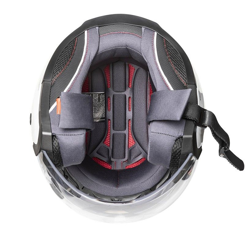 Casco homologado de acuerdo con las regulaciones europeas ECE / ONU 22.06. Sistema Easy-Fit Glasses para colocar las gafas y espacio específico en la calota interior para un intercomunicador Bluetooth. Sistema avanzado de canalización de la ventilación